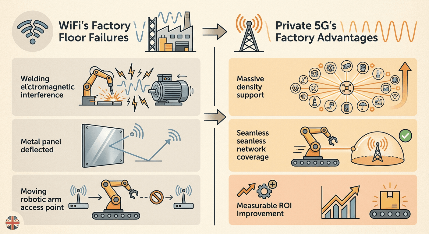 - WiFi fails in factories — electromagnetic interference from welding and motors, signal reflection from metal surfaces, and handover failures for moving robots make WiFi unreliable for critical operations