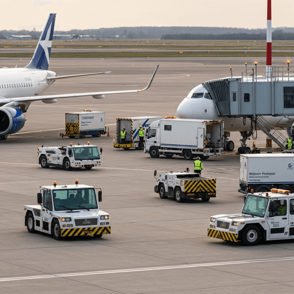 Autonomous or semi-autonomous baggage tractors, pushback tugs, de-icing vehicles, and catering trucks on the apron. Private 5G with sub-metre positioning enables safe autonomous movement where GPS multipath causes errors.