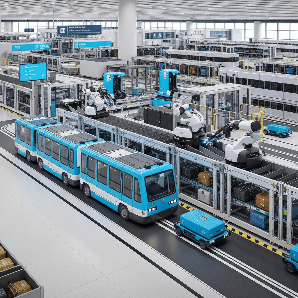 Autonomous tug trains, robotic sorting, and automated storage connected over private 5G across the entire baggage journey. Major airports handle 50,000-100,000+ bags daily — reliable connectivity reduces mishandling and speeds throughput.