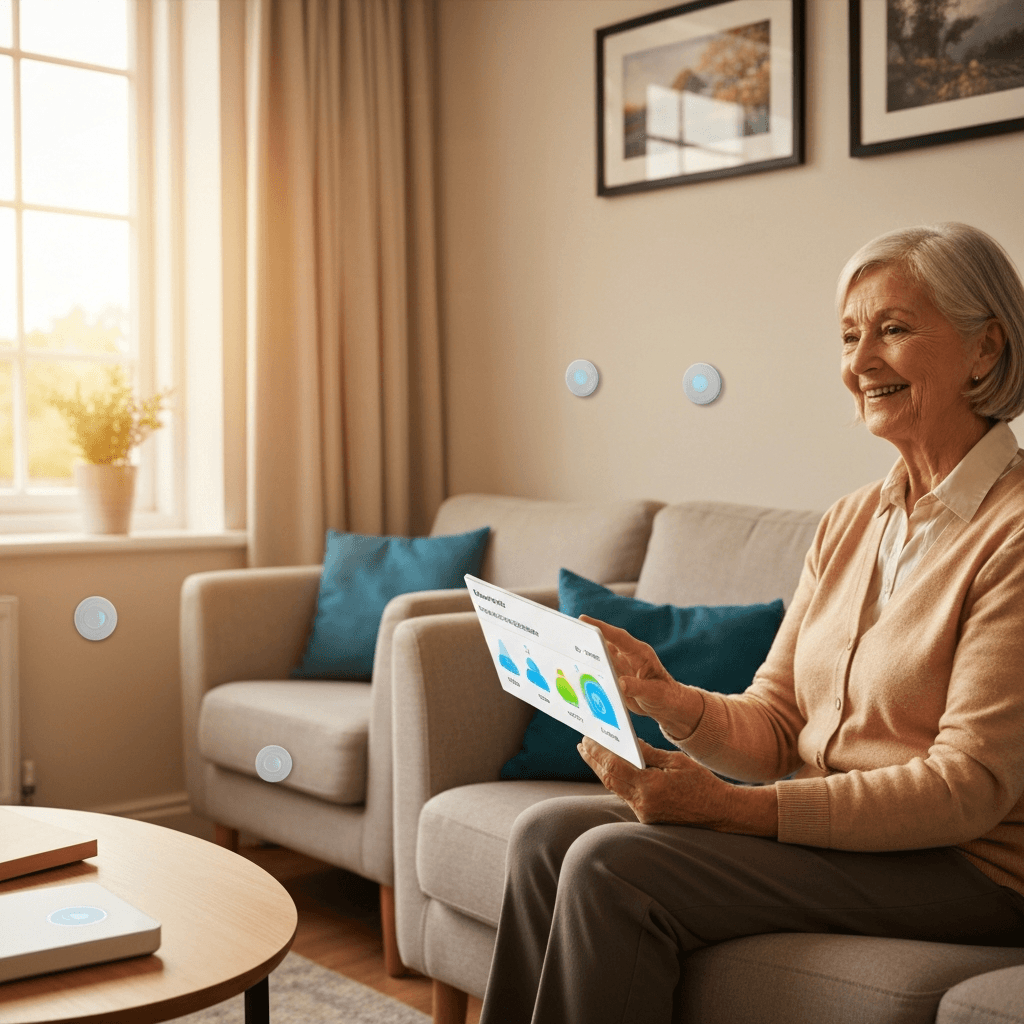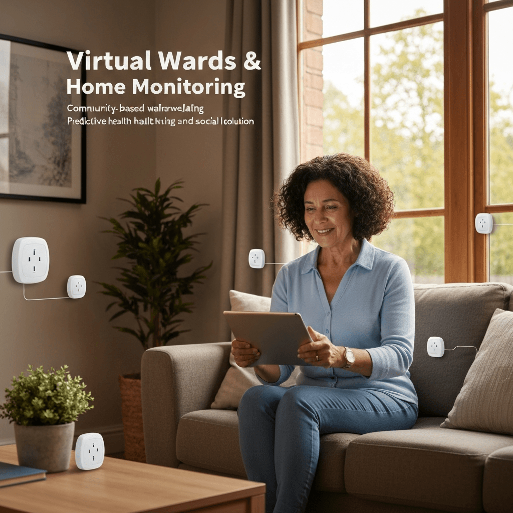 IoT sensors supporting community-based welfare monitoring, medication adherence, predictive health tracking, and combating social isolation. Hospital-level care in the patient's home.