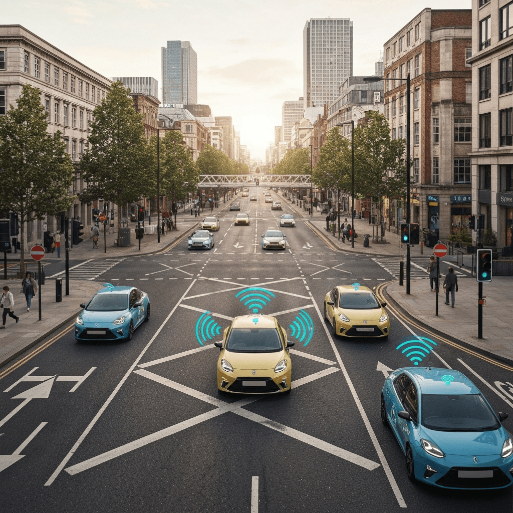 V2X (Vehicle-to-Everything) communications for cyclist and pedestrian alerts, junction assistance, and coordination of autonomous vehicles. Green light prioritisation for freight and public transport.